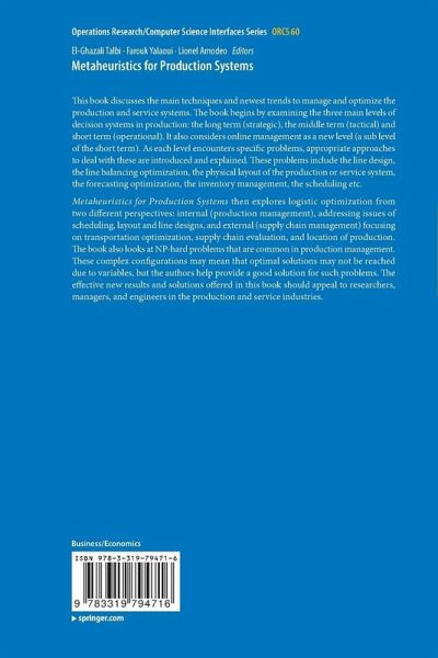 A Literature Survey on Metaheuristics in Production Systems.- Solving Unidirectional Flow Path Design Problems Using Metaheuristics.- Iterated Great Deluge for the Dynamic Facility Layout Problem.- Optimization Approaches for Multi-Level Assembly Systems Under Stochastic Lead Times.- An Adapted NSGA-H Algorithm for a Reconfigurable Manufacturing System (RMS) Design Under Machines Reliability Constraints.- Levy Strategy Based Metaheuristic for Smart Grid.- Minimising Safety Stock and Lead Time in Production Systems Under Guaranteed-Service Time Models by Swarm Intelligence.- Tabu Search Approaches for Two Car Sequencing Problems with Smoothing Constraints.- Investigations on Performance Evaluation of Scheduling Heuristics and Metaheuristics in a Parallel machine Environment.- Scheduling Complex Manufacturing Systems Using a Genetic Algorithm.- An Efficient Heuristic to Minimize the Total Tardiness in the Parallel Machines Scheduling Problem.- Integrated Planning and Scheduling with Dynamic Analysis and Control of Service Level and Costs.- Meta-heuristics Approaches for the Flexible Job Shop Scheduling Problem.- Fuzzy Modeling of Single Machine Scheduling Problems Including the Learning Effect.