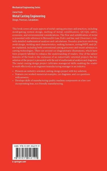 This book covers all main aspects of metal-casting processes and practices, including mold/gating-system design, melting of metal, solidification, QC/QA, safety, economic, and environmental considerations. The flow and solidification of metal is presented with reference to Bernoulli's Law, Fick's 2nd law, and Chvorinov's rule, with detailed mathematical analyses and calculations. Foundry practices involving mold design, molding sand characteristics, melting furnaces, testing/NDT, and QC are explained, including both conventional casting processes and recent advances in casting technologies. There are around 120 diagrammatic illustrations, which have been properly labelled to enhance the understanding of readers. One of the salient features of the book is the inclusion of an industrially-oriented project; the key solution of the project is presented with the aid of mathematical analysis and diagrams. The metal-casting design project cultivates managerial skills enabling the reader to work effectively as an engineer/manufacturing manager in an industry.