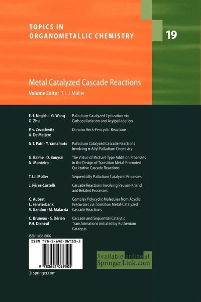 "Cascade reactions, also known as domino reactions, are multibond-forming processes in which the first reaction creates the functionality/geometry necessary for the second reaction to proceed, and so on. Volume 19 of the Topics in Organometallic Chemistry series comprises eight chapters written by experts in the relevant areas and is heavily weighted towards palladium(0)-catalysed processes (5 chapters). Additionally, there is an excellent chapter on the Pauson-Khand reaction (mainly cobald catalysis) and on metathesis (ruthenium)... . Overall, this would not be considered a volume for personal libraries, but is well worth consulting when appropriate. It is to be recommended on that basis." (Ron Grigg, Platinum Metals Review, Vol. 52 (2), 2007)