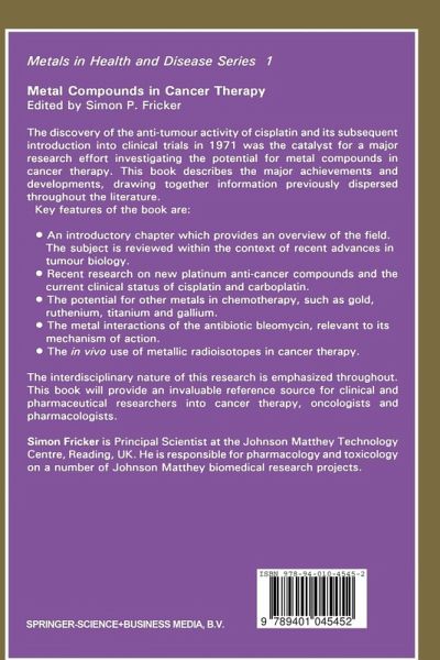 1 Introduction.- 1.1 The Discovery of Cisplatin.- 1.2 Cancer-the Target.- 1.3 The role of Metals in Cancer Therapy.- 1.4 The Search for New Drugs.- 1.5 The Way Forward.- References.- 2 Platinum Anticancer Drugs.- 2.1 Introduction.- 2.2 Platinum Chemistry.- 2.3 Mechanism of Action.- 2.4 Platinum Pharmacology.- 2.5 Platinum Toxicology.- 2.6 The Clinical Impact of Platinum-Based Anticancer Drugs.- 2.7 The Search for New Platinum-Based Anticancer Drugs.- 2.8 Summary.- References.- 3 Gold.- 3.1 Introduction.- 3.2 Gold Chemistry.- 3.3 Gold Biochemistry and Pharmacology.- 3.4 Antitumour Activity of Auranofin and Analogues.- 3.5 [?-Bis(diphenylphosphine)ethane]Digold Species.- 3.6 Bis[1,2-bis(diphenylphosphino)ethane]Gold(I)and Related Complexes, [Au(P-P)2]+.- 3.7 Gold Complexes of Known Antitumour Agents.- 3.8 Other Active Compounds.- 3.9 Cisplatin Analogues.- 3.10 Conclusions.- Acknowledgement.- References.- 4 Ruthenium Compounds in Cancer Therapy.- 4.1 Introduction.- 4.2 Chemical Properties Relevant to Tumour Treatment.- 4.3 Effects on Cancer Growth.- 4.4 Conclusions.- Acknowledgement.- References.- 5 Rhodium, Iridium and Palladium Compounds as Experimental Anticancer Drugs.- 5.1 Introduction.- 5.2 Rhodium.- 5.3 Iridium.- 5.4 Palladium.- 5.5 Comments.- References.- 6 Organometallic Titanium, Vanadium, Niobium, Molybdenum and Rhenium Complexes - Early Transition Metal Antitumour Drugs.- 6.1 Introduction.- 6.2 Antitumour Activity of Titanocene and Vanadocene Dichlorides, Two Neutral Organometallic Complexes of Early Transition Metals.- 6.3 Antitumour Activity of Ionic Titanocene Complexes, Another Type of Organometallic Early Transition Metal Compound.- 6.4 Toxicological and Pharmacokinetic Properties of Neutral Titanocene and Vanadocene Dichloride Complexes.- 6.5 Phase IClinical Trial with Titanocene Dichloride.- 6.6 Antitumour Activity of Ionic Niobocene, Molybdenocene and Rhenocene Complexes, Newly Developed Organometallic Early Transition Metal Complexes.- 6.7 Antitumour Activity of Inorganic Bis(?-diketonato)-Titanium Complexes in Preclinical and Phase I Clinical Trials.- 6.8 Summary and Outlook.- Acknowledgements.- References.- 7 Antitumour Activity of Tin Compounds.- 7.1 Introduction.- 7.2 Early Antitumour Studies Involving Metal Derivatives.- 7.3 Tin Analogues of Cisplatin.- 7.4 Other in Vivo Studies Involving Tin Compounds.- 7.5 In Vitro Studies using Tin Derivatives.- 7.6 Mode of Action.- 7.7 The use of Tin Derivatives in the Photodynamic Therapy of Cancer.- 7.8 Concluding remarks.- Acknowledgements.- References.- 8 Gallium Compounds in Cancer Therapy.- 8.1 Introduction.- 8.2 In Vitro Studies.- 8.3 In Vivo Studies.- 8.4 Clinical Studies.- References.- 9 Bleomycin and Metal Interactions.- 9.1 Introduction.- 9.2 The Activation of Oxygen to Reactive Intermediates by Transition Metal Ions.- 9.3 Binding of Metal Ions to Bleomycin.- 9.4 Binding of Bleomycin to DNA.- 9.5 The Antitumour Activity of Bleomycin.- 9.6 Bleomycin used as a Biological Tool to Detect and Measure Low Molecular Mass Iron in Body Fluids.- Acknowledgements.- References.- 10 The in vivo use of Metallic Radioisotopes in Cancer Detection and imaging.- 10.1 Introduction.- 10.2 Tumour Imaging Applications of Simple Chelates.- 10.3 Tumour Imaging and Therapeutic Applications of Bifunctional Chelates.- 10.4 Radioisotopes.- 10.5 Novel Pretargeting Approaches.- 10.6 Conclusions.- References.