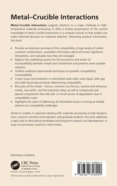 Metal-Crucible Interactions suggests solutions to a major challenge in high-temperature materials processing. It offers a holistic presentation of the current knowledge of metal-crucible interactions in a compact volume so that readers can make informed decisions on materials selection. Presenting practical information, this book: ¿ Provides an extensive summary of the compatibility a huge variety of metal-container combinations, assembles information about all known significant interactions, and evaluates how they are managed ¿ Explains the underlying reasons for the occurrence and extent of incompatibility between metals and containment and presents some possible solutions ¿ Outlines analytical experimental techniques to quantify compatibility/incompatibility ¿ Covers issues and resolution in interrelated solid-solid, solid-liquid, solid-gas and solid-liquid-gas processes determining compatibility ¿ Discusses all the metals - ferrous, common non ferrous, reactive and refractory metals, rare earths, and the important alloys as well as compounds and special compositions that tide over or remain prone to degradation due to compatibility issues ¿ Highlights the value of addressing all interrelated issues in arriving at reliable solutions to compatibility challenges Aimed at readers in industries dealing with materials processing at high temperatures, research scientists and engineers, and graduate students, this book addresses a topic vital to stimulating immediate and long-term research and development, in ways not previously covered in other books.
