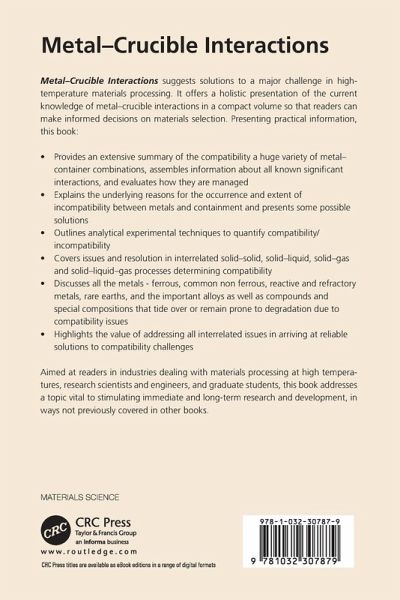 Offering readers insight into issues related to metal-crucible interactions, this book suggests solutions to a major challenge in high-temperature materials processing. It offers a holistic presentation of the current knowledge of metal-crucible interactions in a compact volume so that readers can take informed decisions on materials selection.
