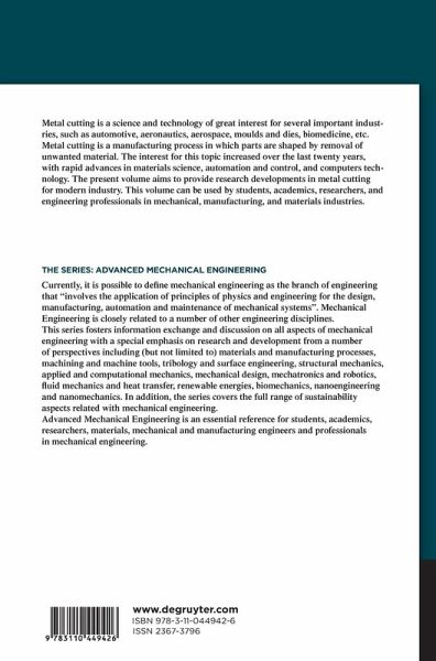Metal cutting is a science and technology of great interest for several important industries, such as automotive, aeronautics, aerospace, moulds and dies, biomedicine, etc. Metal cutting is a manufacturing process in which parts are shaped by removal of unwanted material. The interest for this topic increased over the last twenty years, with rapid advances in materials science, automation and control, and computers technology. The present volume aims to provide research developments in metal cutting for modern industry. This volume can be used by students, academics, researchers, and engineering professionals in mechanical, manufacturing, and materials industries.