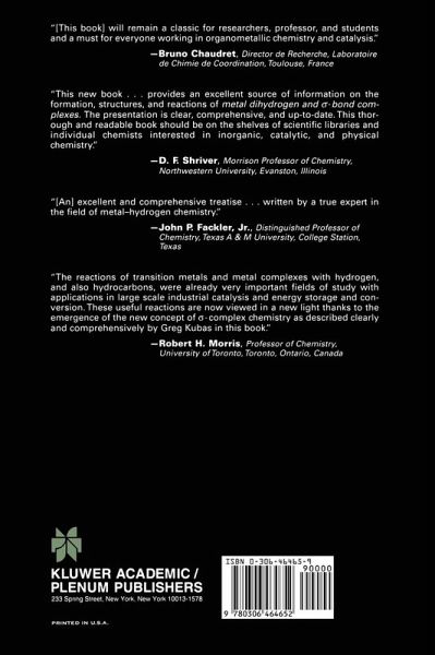 `[This book] will remain a classic for researchers, professors, and students and a must for everyone working in organometallic Chemistry and Catalysis.' Bruno Chaudret, Director de Recherche, Laboratoire de Chimie de Coordination `This new book provides an excellent source of information on the formation, structures, and reactions of Metal Dihydrogen and sigma-Bond Complexes. The presentation is clear, comprehensive and up-to-date. This thorough and readable book should be on the shelves of scientific libraries and individual chemists interested in inorganic, catalytic and physical chemistry.' D.F. Shriver, Morrison Professor of Chemistry, Northwestern University `[An] excellent and comprehensive treatise...a true expert in the field of metal-hydrogen chemistry.' John P. Fackler, Jr., Distinguished Professor of Chemistry, Texas A&M University `The reactions of transition metals and metal complexes with hydrogen, and also hydrocarbons, were already very important fields of study with applications in large scale industrial catalysis and energy storage and conversion. These useful reactions are now viewed in a new light thanks to the emergence of the new concept of sigma-complex chemistry as described clearly and comprehensively by Greg Kubas in this book.' Robert H. Morris, Professor of Chemistry, University of Toronto `This book will be of use to persons whose research interests include the subject matter of the book, but I also recommend sections of it more broadly... I strongly recommend the book for those who are involved in the field. It is very well written...' Ray L. Sweany, University of new Orleans in Journal of the American Chemical Society `I strongly recommend the book for those who are involved in the field. It is very well written, and for those who are worried about the time delay between the onset of the writing and the publication, some references come from as late as the latter half of 2000' J.AM.Chem. Soc., 124:14 (2002)