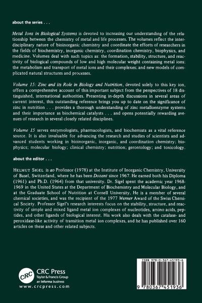 This volume first considers the categories of zinc metalloenzymes, together with models of the enzymic metal-ion binding sites. It covers the nutritional aspects of zinc: its absorption and excretion, its influence on the activity of enzymes and hormones, and the zinc deficiency syndrome.