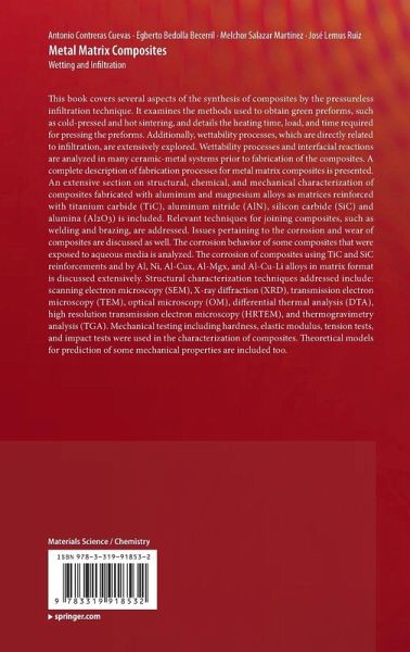 This book covers several aspects of the synthesis of composites by the pressureless infiltration technique. It describes the methods used to obtain green preforms, such as cold pressed and hot sintering, describing the heating time, load, and time required for pressing the preforms. Additionally, wettability phenomena, which is directly related on infiltration, is extensively described. Wettability process and interfacial reactions are analyzed in many ceramic-metal systems prior to fabricate the composites. A complete description of fabrication processes for Metal Matrix Composites is included. An extensive section on structural, chemical, and mechanical characterization of composites fabricated with aluminum and magnesium alloys as matrices reinforced with titanium carbide (TiC), aluminum nitride (AlN), silicon carbide (SiC) and alumina (Al2O3) is included. Relevant techniques for joining composites, such as welding and brazing are addressed. As well as issues pertaining to the corrosion and wear of composites are discussed as well. Corrosion behavior of some composites exposed to aqueous media was analyzed. Corrosion of composites using TiC and SiC like reinforcement and Al, Ni, and some Al-Cux, Al-Mgx and Al-Cu-Li alloys like matrix is discussed extensively. The structural characterization techniques addressed include: scanning electron microscopy (SEM), X-ray diffraction (XRD), transmission electron microscopy (TEM), optical microscopy (OM), differential thermal analysis (DTA), high resolution transmission electron microscopy (HRTEM), and thermogravimetry analysis (TGA). Mechanical testing including hardness, elastic modulus, tension tests, and impact tests were used in the characterization of composites. Theoretical models for prediction of some mechanical properties are included too.