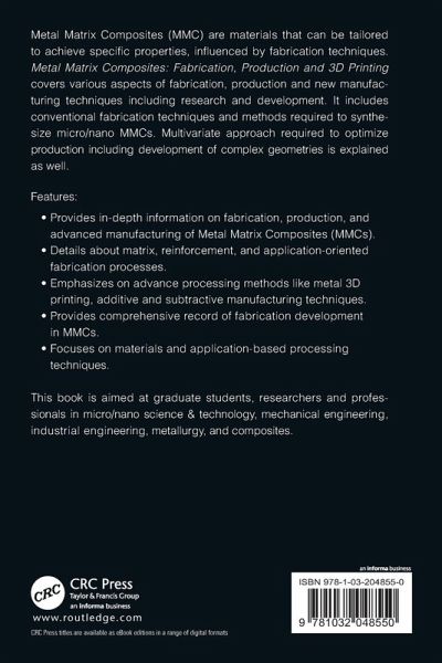 Metal Matrix Composites: Fabrication, Production and 3D Printing" cover various aspects of fabrication, production and new manufacturing techniques including research and development. It includes conventional fabrication techniques and methods required to synthesize micro/nano MMCs with multivariate approach required to optimize production.