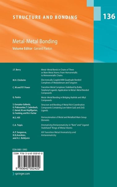 John Berry: Metal-Metal Bonds in Chains of Three or More Metal Atoms: From Homometallic to Heterometallic Chains.- Malcolm Chisholm: Electronically Coupled MM Quadruple Bonded Complexes of Molybdenum and Tungsten.- Philip Power: Transition Metal Complexes Stabilized by Bulky Terphenyl Ligands: Applications to Metal-Metal Bonded Compounds.- Gerard Parkin: Metal-Metal Bonding in Bridging Hydride and Alkyl Compounds.- Roland Fischer and Gernot Frenking: Structure and Bonding of Metal Rich Coordination Compounds Containing Low Valent Ga(I) and Zn(I) Ligands.- Mike Hill: Homocatenation of Metal and Metalloid Main Group Elements.- Constandinos A. Tsipis: Aromaticity/Antiaromaticity in "Bare" and ''Ligand-Stabilized'' Rings of Metal Atoms.- Alexander Boldyrev: All-Transition Metal Aromaticity and Antiaromaticity.