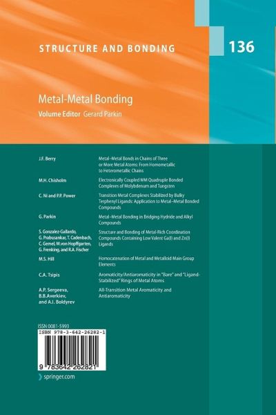 John Berry: Metal-Metal Bonds in Chains of Three or More Metal Atoms: From Homometallic to Heterometallic Chains.- Malcolm Chisholm: Electronically Coupled MM Quadruple Bonded Complexes of Molybdenum and Tungsten.- Philip Power: Transition Metal Complexes Stabilized by Bulky Terphenyl Ligands: Applications to Metal-Metal Bonded Compounds.- Gerard Parkin: Metal-Metal Bonding in Bridging Hydride and Alkyl Compounds.- Roland Fischer and Gernot Frenking: Structure and Bonding of Metal Rich Coordination Compounds Containing Low Valent Ga(I) and Zn(I) Ligands.- Mike Hill: Homocatenation of Metal and Metalloid Main Group Elements.- Constandinos A. Tsipis: Aromaticity/Antiaromaticity in "Bare" and ''Ligand-Stabilized'' Rings of Metal Atoms.- Alexander Boldyrev: All-Transition Metal Aromaticity and Antiaromaticity.