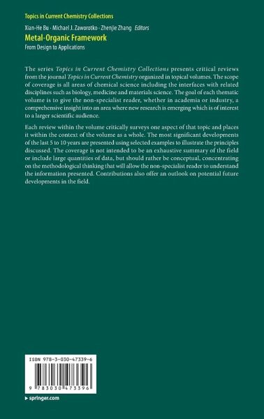Functionalized Metal-Organic Frameworks as Smart Switch for Sensor and Adsorption.- Metal-Organic Frameworks in Desulfurization of Fuels.- Why design matters: From decorated metal-oxide clusters to functional metal-organic frameworks.- The Exploration on Electronic and Electrochemical Applications of Two-Dimensional Metal-Organic Frameworks.- Recent Advances of Techniques for the incorporation of Biomolecules in Metal-Organic Frameworks.- Applications and Advantages of Organosulfonate-based metal-organic frameworks.- Insights into the Gas Adsorption Mechanisms in Metal-Organic Frameworks from Classical Molecular Simulations.- Current Status of Microporous Metal-Organic Frameworks for Hydrocarbon Separation.- Mechanical Properties of Shaped Metal-Organic Frameworks.- Regulation of the degree of interpenetration in metal-organic frameworks.- Switching 2-dimentional square lattice networks.- Organometallic Chemistry in Metal-Organic Frameworks.- Metal-Organic Frameworks catalyzed chemical conversion of CO2.