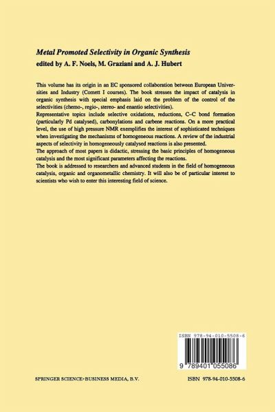 The demand for selective organic reactions is growing more acute everyday. Indeed, greater product selectivity has an important impact on energy and resource utilization, in terms of reduced process energy requirements for product separation and purification, in terms of low-value by-products, and in terms of environmental acceptance and compatibility. Moreover, more and more chemicals, especially pharmaceuticals, have to be sold in an optically active form. The search for selectivity constitutes a tremendous challenge for the chemists. In the last two decades, homogeneous transition metal based catalysis has emerged as one of the most promising tools for obtaining selectivity. In connection with developments in this area, this book contains updated and expanded versions of most of the lectures presented at a Cornett course held in Trieste (Italy) in 1989 and sponsored by the European Community. A primary aim is to cultivate a deeper understanding of the parameters that govern the selectivities and stimulate a wider utilization of transition metal based catalysis in organic synthesis. All aspects of selectivity, chemo-, regio-, stereo- and enantioselectivity are considered and illustrated by applications in various fields or organic synthesis. The impact of catalysis in oxydation, reduction, carbonylation reactions, carbene chemistry, in Ni and Pd promoted dimerizations, oligomerizations as well as fonctionalisations is stressed, quite often with special emphasis laid on reaction mechanisms. In this aspect, the last chapter examplifies the interest of high pressure NMR and IR when investigating the nature of reaction intermediates in homogeneous reactions.