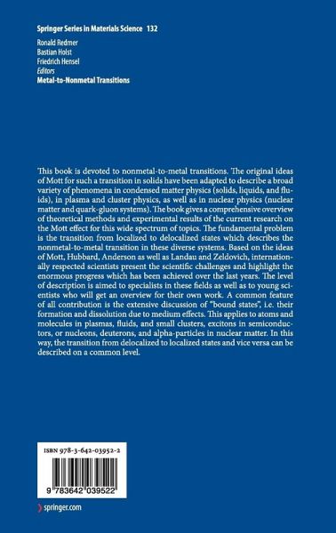 This book is devoted to nonmetal-to-metal transitions. The original ideas of Mott for such a transition in solids have been adapted to describe a broad variety of phenomena in condensed matter physics (solids, liquids, and fluids), in plasma and cluster physics, as well as in nuclear physics (nuclear matter and quark-gluon systems). The book gives a comprehensive overview of theoretical methods and experimental results of the current research on the Mott effect for this wide spectrum of topics. The fundamental problem is the transition from localized to delocalized states which describes the nonmetal-to-metal transition in these diverse systems. Based on the ideas of Mott, Hubbard, Anderson as well as Landau and Zeldovich, internationally respected scientists present the scientific challenges and highlight the enormous progress which has been achieved over the last years. The level of description is aimed to specialists in these fields as well as to young scientists who will get an overview for their own work. A common feature of all contribution is the extensive discussion of "bound states", i.e. their formation and dissolution due to medium effects. This applies to atoms and molecules in plasmas, fluids, and small clusters, excitons in semiconductors, or nucleons, deuterons, and alpha-particles in nuclear matter. In this way, the transition from delocalized to localized states and vice versa can be described on a common level.