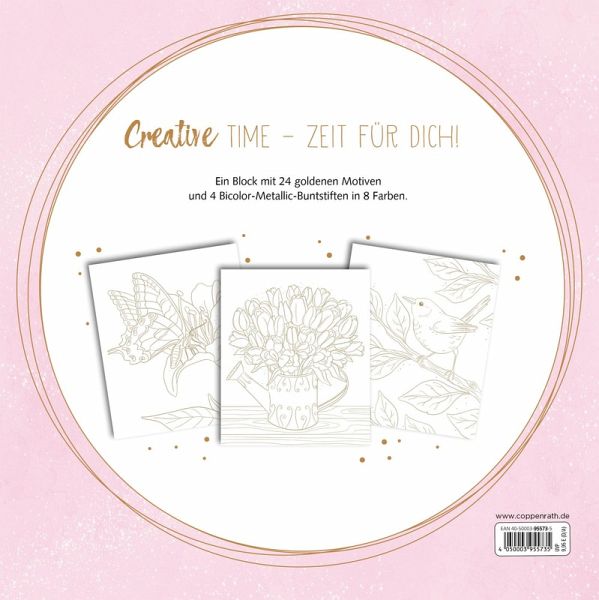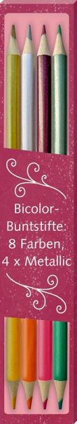 Ein Malblock mit wunderschönen Ausmalmotiven und 4 Doppelstiften (4 Buntstift-Farben und 4 Metallic-Buntstift-Farben).