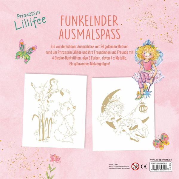 Ein wunderschöner Ausmalblock mit 24 goldenen Motiven rund um Prinzessin Lillifee und ihre Freundinnen und Freunde mit 4 besonderen Bicolor-Buntstiften: Die Stifte haben jeweils auf einer Seite eine normale Buntstiftfarbe und auf einer Seite eine glänzende Metallicfarbe. Insgesamt gibt es also 8 Farben, davon 4 x Metallic. Ein tolles Ausmal-Set zum Sofort-Loslegen für kleine Prinzessinnen und Prinzen!