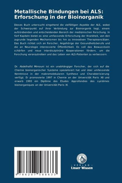 Dieses Buch untersucht eingehend die vielfältigen Aspekte der ALS, wobei der Schwerpunkt auf ihrer Verbindung zur Bioinorganik liegt, einem aufstrebenden und entscheidenden Bereich der medizinischen Forschung. In fünf Kapiteln bietet es eine umfassende Erforschung der Krankheit, von den zugrunde liegenden Mechanismen bis hin zu innovativen Therapieansätzen. Das Buch richtet sich an Forscher, Angehörige der Gesundheitsberufe und die an Neurologie interessierte Öffentlichkeit. Es soll das Bewusstsein schärfen und neue interdisziplinäre Kooperationen fördern, um die Forschung voranzutreiben und das Leben von ALS-Patienten zu verbessern.