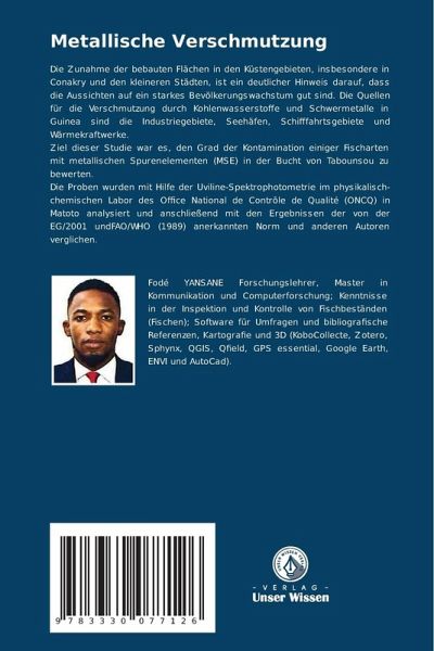 Die Zunahme der bebauten Flächen in den Küstengebieten, insbesondere in Conakry und den kleineren Städten, ist ein deutlicher Hinweis darauf, dass die Aussichten auf ein starkes Bevölkerungswachstum gut sind. Die Quellen für die Verschmutzung durch Kohlenwasserstoffe und Schwermetalle in Guinea sind die Industriegebiete, Seehäfen, Schifffahrtsgebiete und Wärmekraftwerke.Ziel dieser Studie war es, den Grad der Kontamination einiger Fischarten mit metallischen Spurenelementen (MSE) in der Bucht von Tabounsou zu bewerten.Die Proben wurden mit Hilfe der Uviline-Spektrophotometrie im physikalisch-chemischen Labor des Office National de Contrôle de Qualité (ONCQ) in Matoto analysiert und anschließend mit den Ergebnissen der von der EG/2001 undFAO/WHO (1989) anerkannten Norm und anderen Autoren verglichen.