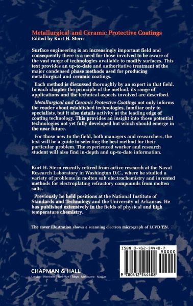 1 Introduction.- 1.1 Protective coatings.- 1.2 Stresses.- 1.3 Selection of coating materials.- 1.4 Methods of application.- 1.5 Electroplating - an example of a technology.- 1.6 Plan of this book.- References.- 2 Electrodeposition of refractory metals from molten salts.- 2.1 Introduction.- 2.2 Experimental techniques.- 2.3 The refractory metals.- References.- 3 Metalliding.- 3.1 Introduction.- 3.2 The metalliding process.- 3.3 Properties of metallided layers.- 3.4 Individual metalliders.- 3.5 Conclusions.- References.- 4 Electrodeposition of refractory compounds from molten salts - borides, carbides and suicides.- 4.1 Introduction.- 4.2 Methodology.- 4.3 Boron and the borides.- 4.4 Silicon and the silicides.- 4.5 Carbon and the carbides.- 4.6 Conclusions.- References.- 5 Laser assisted surface coatings.- 5.1 Laser surface alloying.- 5.2 Laser surface cladding.- 5.3 Laser chemical vapor deposition (LCVD).- References.- 6 Sol-gel derived ceramic films - fundamentals and applications.- 6.1 Introduction.- 6.2 Sol-gel chemistry.- 6.3 Deposition by dip-coating.- 6.4 Deposition by spin-coating.- 6.5 Effects of entrained condensed phases.- 6.6 Drying of films.- 6.7 Control of film microstructure.- 6.8 Applications.- 6.9 Summary 148 Acknowledgments.- References.- 7 Solid phase cladding.- 7.1 Introduction.- 7.2 Explosive cladding.- 7.3 Roll bonding.- 7.4 Friction surfacing.- 7.5 Resistance cladding.- 7.6 Hot isostatic pressing.- 7.7 Summary 191 References.- 8 Thermal barrier coatings.- 8.1 Introduction.- 8.2 Material requirements.- 8.3 Stabilization of zirconia.- 8.4 Phase transformation reactions of stabilized zirconia.- 8.5 Identification of phases in stabilized zirconia.- 8.6 Zirconia thermal barrier coatings.- 8.7 Causes for failure of zirconia TBCs.- 8.8 Alleviation ofTBC hot corrosion.- 8.9 Future uses and trends for zirconia TBCs.- References.- 9 Pack cementation diffusion coatings.- 9.1 Principles and history.- 9.2 Range of applicability.- 9.3 Technical aspects.- 9.4 Possibilities for improvement.- 9.5 Summary 257 Acknowledgments.- References.- 10 Thermal spray coatings.- 10.1 Introduction.- 10.2 Thermal spray processes.- 10.3 Feed materials.- 10.4 Particle-plasma interaction and process control.- 10.5 Deposit formation dynamics.- 10.6 Materials science of thermal spray deposits.- 10.7 Thermal spray coating applications.- 10.8 Thermal spray and advanced manufacturing.- 10.9 Summary.- References.- 11 Degradation of coatings by high temperature atmospheric corrosion and molten salt deposits.- 11.1 Introduction.- 11.2 Metallic coatings.- 11.3 Ceramic coatings.- 11.4 Erosion 303 References.- 12 Measurement of coating adhesion.- 12.1 Introduction.- 12.2 Surface engineering.- 12.3 The requirements of an ideal adhesion test.- 12.4 Methods of adhesion evaluation.- 12.5 Summary.- References.