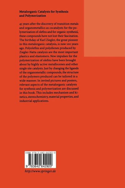 45 years after the discovery of transition metals and organometallics as cocatalysts for the polymerization of olefins and for organic synthesis, these compounds have not lost their fascination. The birthday of Karl Ziegler, the great pioneer in this metalorganic catalysis, is now 100 years ago. Polyolefins and polydienes produced by Ziegler-Natta catalysis are the most important plastics and elastomers. New impulses for the polymerization of olefins have been brought about by highly active metallocenes and other single site catalysts. Just by changing the ligands of the organometallic compounds, the structure of the polymers produced can be tailored in a wide manner. In invited lectures and posters, relevant aspects of the metalorganic catalysts for synthesis and polymerization are discussed in this book. This includes mechanism and kinetics, stereochemistry, material properties, and industrial applications.