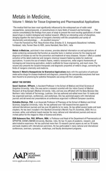 1. Recent Advancements in Nanoporous Metal Foams for Biomedical Applications: Processing and Mechanical Properties 2. Metallic Biomaterials for Pharmaceutical and Biomedical Applications 3. Metallic Nanocarriers for Bone Tissue Engineering 4. Metallic Foams for Biomedical Applications 5. Role of Metal-Organic Framework in Therapeutic Delivery 6. Metal-Organic Framework in Bioimaging and Biosensing Applications 7. Synthesis, Properties, and Biomedical Applications of Platinum and Palladium-Based Nanoparticles 8. Stimuli-Responsive Drug Delivery Carrier Using Metal-Organic Framework 9. Metallic Scaffold for Tissue Engineering
