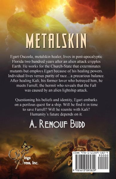 Two hundred years after an alien attack cripples Earth, mutations are frequent but Egart's metalskin is unique. The Church-State of Florida exterminates mutants but employs Egart because he's a powerful healer. Individual lives versus purity of race, a precarious balance. En route to becoming a priest, Egart is summoned to heal Kali, his former lover who betrayed him. He cures her, meets Farrell, and learns that the Fall was caused by an alien attack. Surviving a perilous quest for a lightship, Egart bonds with it, reunites with Kali and his long-lost father...but can he rescue Farrell?