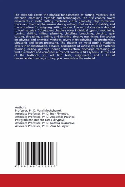 The textbook covers the physical fundamentals of cutting materials, tool materials, machining methods and technologies. The first chapter covers movements in metal cutting machines, cutter geometry, chip formation, forces and thermal phenomena during cutting, tool wear and stability, and the procedure for assigning cutting modes. The second chapter is devoted to tool materials. Subsequent chapters cover individual types of machining: turning, drilling, milling, planning, chiselling, broaching, piercing, gear cutting, threading, grinding, and finishing abrasive machining. The section on physical and chemical methods covers electrophysical, electrochemical, ultrasonic and beam processing. The chapter on metal-cutting machines covers their classification, detailed descriptions of various types of machines (turning, milling, grinding, boring, and electrical discharge machining), as well as robotics and computer numerical control (CNC) systems. At the end of the textbook, you will find tests, assignments, and a list of recommended readings to help you consolidate the material.