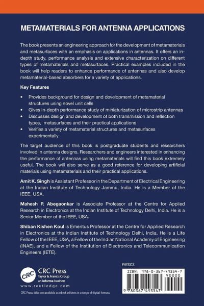 Fundamentals of Metamaterials. Design, Fabrication and Testing of Metamaterials. Miniaturization of Microstrip Patch Antenna Using Metamaterials. High Gain Antenna using Reflection Type Metasurface. High Gain Antenna using Transmission Type Metasurface. Beam Steerable High Gain Antenna using Graded Index Metamaterial Surface. Microwave Metamaterial Absorber. Index.