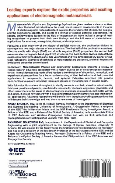 Metamaterials: Physics and Engineering Explorations gives readers a clearly written, richly illustrated introduction to the most recent research developments in the area of electromagnetic metamaterials. It explores the fundamental physics, the designs, and the engineering aspects, and points to a myriad of exciting potential applications. The editors, acknowledged leaders in the field of metamaterials, have invited a group of leading researchers to present both their own findings and the full array of state-of-the-art applications for antennas, waveguides, devices, and components.