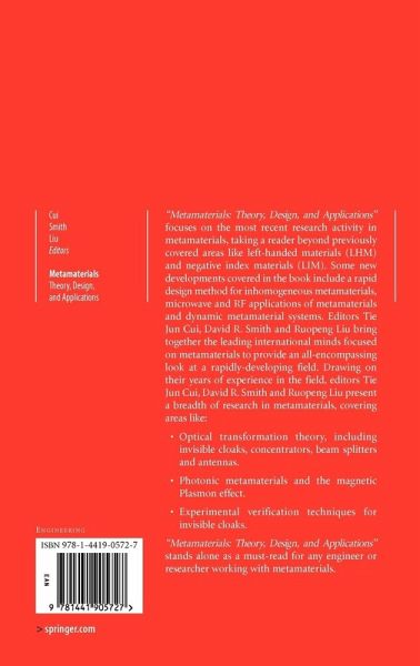 Metamaterials:Theory, Design, and Applications goes beyond left-handed materials (LHM) or negative index materials (NIM) and focuses on recent research activity. Included here is an introduction to optical transformation theory, revealing invisible cloaks, EM concentrators, beam splitters, and new-type antennas, a presentation of general theory on artificial metamaterials composed of periodic structures, coverage of a new rapid design method for inhomogeneous metamaterials, which makes it easier to design a cloak, and new developments including but not limited to experimental verification of invisible cloaks, FDTD simulations of invisible cloaks, the microwave and RF applications of metamaterials, sub-wavelength imaging using anisotropic metamaterials, dynamical metamaterial systems, photonic metamaterials, and magnetic plasmon effects of metamaterials.