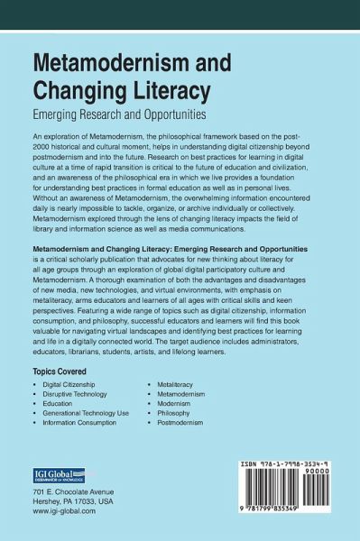 An exploration of Metamodernism, the philosophical framework based on the post-2000 historical and cultural moment, helps in understanding digital citizenship beyond postmodernism and into the future. Research on best practices for learning in digital culture at a time of rapid transition is critical to the future of education and civilization, and an awareness of the philosophical era in which we live provides a foundation for understanding best practices in formal education as well as in personal lives. Without an awareness of Metamodernism, the overwhelming information encountered daily is nearly impossible to tackle, organize, or archive individually or collectively. Metamodernism explored through the lens of changing literacy impacts the field of library and information science as well as media communications. Metamodernism and Changing Literacy: Emerging Research and Opportunities is a critical scholarly publication that advocates for new thinking about literacy for all age groups through an exploration of global digital participatory culture and Metamodernism. A thorough examination of both the advantages and disadvantages of new media, new technologies, and virtual environments, with emphasis on metaliteracy, arms educators and learners of all ages with critical skills and keen perspectives. Featuring a wide range of topics such as digital citizenship, information consumption, and philosophy, successful educators and learners will find this book valuable for navigating virtual landscapes and identifying best practices for learning and life in a digitally connected world. The target audience includes administrators, educators, librarians, students, artists, and lifelong learners.