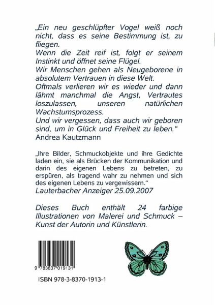 "Ein neu geschlüpfter Vogel weiß noch nicht, dass es seine Bestimmung ist, zu fliegen.Wenn die Zeit reif ist, folgt er seinem Instinkt und öffnet seine Flügel.Wir Menschen gehen als Neugeborene in absolutem Vertrauen in diese Welt.Oftmals verlieren wir es wieder und dann lähmt manchmal die Angst, Vertrautes loszulassen, unseren natürlichen Wachstumsprozess.Und wir vergessen, dass auch wir geboren sind, um in Glück und Freiheit zu leben." Andrea Kautzmann"Ihre Bilder, Schmuckobjekte und ihre Gedichte laden ein, sie als Brücken der Kommunikation und darin des eigenen Lebens zu betreten, zu erspüren, als tragend wahr zu nehmen und sich des eigenen Lebens zu vergewissern."Lauterbacher Anzeiger 25.09.2007Dieses Buch enthält 24 farbige Illustrationen von Malerei und Schmuck - Kunst der Autorin und Künstlerin.