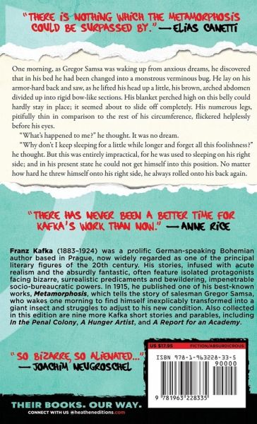 Franz Kafka (1883-1924) was a prolific German-speaking Bohemian author based in Prague, now widely regarded as one of the principal literary figures of the 20th century. His stories, infused with acute realism and the absurdly fantastic, often feature isolated protagonists facing bizarre, surrealistic predicaments and bewildering, impenetrable socio-bureaucratic powers. In 1915, he published one of his best-known works, Metamorphosis, which tells the story of salesman Gregor Samsa, who wakes one morning to find himself inexplicably transformed into a giant insect and struggles to adjust to his new condition. Also collected in this edition are ten more Kafka short stories and parables, including In the Penal Colony, A Hunger Artist, and A Report for an Academy.
