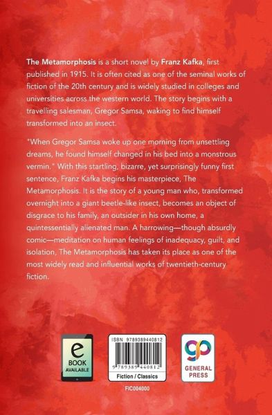 The Metamorphosis' is a short novel by Franz Kafka, first published in 1915. It is often cited as one of the seminal works of fiction of the 20th century and is widely studied in colleges and universities across the western world. The story begins with a travelling salesman, Gregor Samsa, waking to find himself transformed into an insect. ""When Gregor Samsa woke up one morning from unsettling dreams, he found himself changed in his bed into a monstrous vermin."" With this startling, bizarre, yet surprisingly funny first sentence, Franz Kafka begins his masterpiece, 'The Metamorphosis'. It is the story of a young man who, transformed overnight into a giant beetlelike insect, becomes an object of disgrace to his family, an outsider in his own home, a quintessentially alienated man. A harrowing-though absurdly comic-meditation on human feelings of inadequacy, guilt, and isolation, 'The Metamorphosis' has taken its place as one of the most widely read and influential works of twentieth-century fiction.