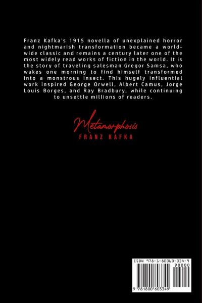 Do you want to read Metamorphosis? If so then keep reading... Franz Kafka's 1915 novella of unexplained horror and nightmarish transformation became a worldwide classic and remains a century later one of the most widely read works of fiction in the world. It is the story of traveling salesman Gregor Samsa, who wakes one morning to find himself transformed into a monstrous insect. This hugely influential work inspired George Orwell, Albert Camus, Jorge Louis Borges, and Ray Bradbury, while continuing to unsettle millions of readers. What are you waiting for Metamorphosis is one click away, select the "Buy Now" button in the top right corner NOW!