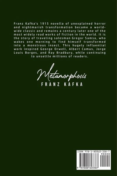 Do you want to read Metamorphosis? If so then keep reading... Franz Kafka's 1915 novella of unexplained horror and nightmarish transformation became a worldwide classic and remains a century later one of the most widely read works of fiction in the world. It is the story of traveling salesman Gregor Samsa, who wakes one morning to find himself transformed into a monstrous insect. This hugely influential work inspired George Orwell, Albert Camus, Jorge Louis Borges, and Ray Bradbury, while continuing to unsettle millions of readers. What are you waiting for Metamorphosis is one click away, select the "Buy Now" button in the top right corner NOW!