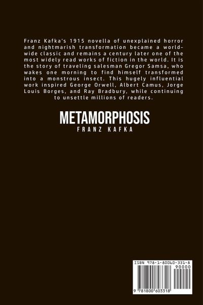 Do you want to read Metamorphosis? If so then keep reading... Franz Kafka's 1915 novella of unexplained horror and nightmarish transformation became a worldwide classic and remains a century later one of the most widely read works of fiction in the world. It is the story of traveling salesman Gregor Samsa, who wakes one morning to find himself transformed into a monstrous insect. This hugely influential work inspired George Orwell, Albert Camus, Jorge Louis Borges, and Ray Bradbury, while continuing to unsettle millions of readers. What are you waiting for Metamorphosis is one click away, select the "Buy Now" button in the top right corner NOW!
