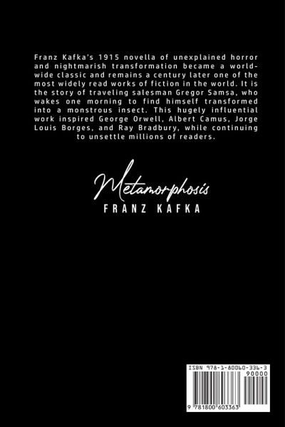 Do you want to read Metamorphosis? If so then keep reading... Franz Kafka's 1915 novella of unexplained horror and nightmarish transformation became a worldwide classic and remains a century later one of the most widely read works of fiction in the world. It is the story of traveling salesman Gregor Samsa, who wakes one morning to find himself transformed into a monstrous insect. This hugely influential work inspired George Orwell, Albert Camus, Jorge Louis Borges, and Ray Bradbury, while continuing to unsettle millions of readers. What are you waiting for Metamorphosis is one click away, select the "Buy Now" button in the top right corner NOW!