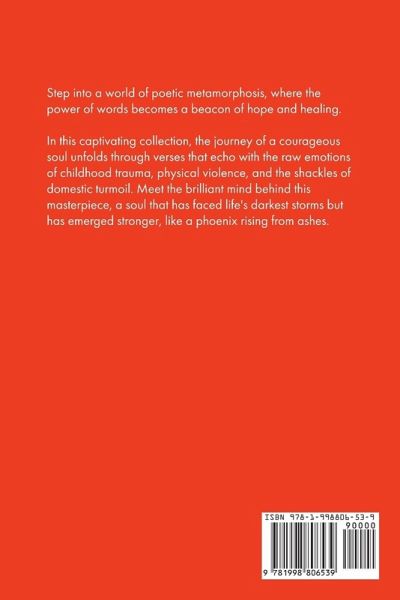 Step into a world of poetic metamorphosis, where the power of words becomes a beacon of hope and healing. In this captivating collection, the journey of a courageous soul unfolds through verses that echo with the raw emotions of childhood trauma, physical violence, and the shackles of domestic turmoil. Meet the brilliant mind behind this masterpiece, a soul that has faced life's darkest storms but has emerged stronger, like a phoenix rising from ashes. In the depths of pain lies the birth of resilience, and within the chaos, the seeds of transformation are sown. "Metamorphosis" is an awe-inspiring poetry book that delves into the life of an individual who has weathered a storm of trials, facing hardships that could have broken the spirit of most. Yet, through the power of the written word, a path to redemption was found. Raw, unapologetic, and profound, each poem in this collection serves as a powerful reminder of the human spirit's capacity to endure and thrive. With an unerring sense of honesty, the poet bares their soul, unveiling their struggles with childhood trauma, the scars of physical violence, and the torment of enduring domestic struggles. Through verse after verse, the shadows of the past are explored, but they are not allowed to suffocate the hope that springs eternal. As you turn the pages, you'll embark on an unforgettable journey through the depths of despair and the heights of triumph. The verses are not merely words but fragments of a soul laid bare, woven together with the strength to heal and the desire to enlighten others. The metamorphosis is palpable in each poem, an ever-evolving transformation like a butterfly breaking free from its cocoon. This poetic odyssey celebrates the beauty of the human spirit's capacity to adapt, learn, and grow. With every line, readers will find themselves drawn into the poet's world, connecting with the emotions that bind us all as human beings. It is a testament to the resilience that can be found even in the most shattered hearts, and it reminds us all that we are works in progress. Metamorphosis: Embracing the Shadows, Illuminating the Soul is not just a collection of poems; it's an exploration of the human experience in all its complexity. For those who have faced their own trials and tribulations, this book will serve as a beacon of hope, a reminder that they are not alone and that healing is possible. And for those who have been fortunate enough to escape such hardships, these verses will provide an empathetic window into the lives of others, fostering a deeper understanding and compassion. Discover the transformative power of poetry, as one soul's journey through darkness ignites a light of inspiration for all. Open these pages and let the healing words of Metamorphosis touch your heart, forever changing the way you view the power of resilience and the beauty of the human spirit.