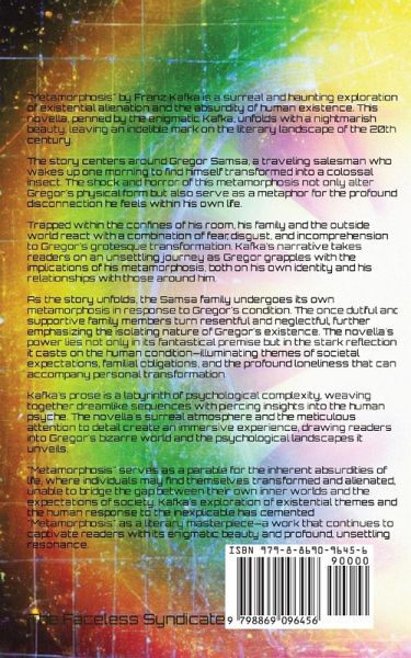 "Metamorphosis" by Franz Kafka is a surreal and haunting exploration of existential alienation and the absurdity of human existence. This novella, penned by the enigmatic Kafka, unfolds with a nightmarish beauty, leaving an indelible mark on the literary landscape of the 20th century. The story centers around Gregor Samsa, a traveling salesman who wakes up one morning to find himself transformed into a colossal insect. The shock and horror of this metamorphosis not only alter Gregor's physical form but also serve as a metaphor for the profound disconnection he feels within his own life. Trapped within the confines of his room, his family and the outside world react with a combination of fear, disgust, and incomprehension to Gregor's grotesque transformation. Kafka's narrative takes readers on an unsettling journey as Gregor grapples with the implications of his metamorphosis, both on his own identity and his relationships with those around him. As the story unfolds, the Samsa family undergoes its own metamorphosis in response to Gregor's condition. The once dutiful and supportive family members turn resentful and neglectful, further emphasizing the isolating nature of Gregor's existence. The novella's power lies not only in its fantastical premise but in the stark reflection it casts on the human condition-illuminating themes of societal expectations, familial obligations, and the profound loneliness that can accompany personal transformation. Kafka's prose is a labyrinth of psychological complexity, weaving together dreamlike sequences with piercing insights into the human psyche. The novella's surreal atmosphere and the meticulous attention to detail create an immersive experience, drawing readers into Gregor's bizarre world and the psychological landscapes it unveils. "Metamorphosis" serves as a parable for the inherent absurdities of life, where individuals may find themselves transformed and alienated, unable to bridge the gap between their own inner worlds and the expectations of society. Kafka's exploration of existential themes and the human response to the inexplicable has cemented "Metamorphosis" as a literary masterpiece-a work that continues to captivate readers with its enigmatic beauty and profound, unsettling resonance.