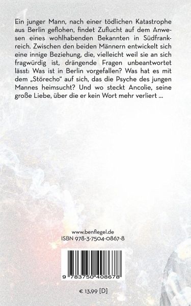 Ein junger Mann ist tief erschüttert und stößt jegliche Verantwortung von sich. Er versucht zu verdrängen. Ein tragischer Tod, der Höhepunkt einer größeren Katastrophe, treibt ihn von Berlin nach Südfrankreich zu einem wohlhabenden Bekannten, der ihm Schutz auf seinem Anwesen gewährt. Zwischen den beiden Männern entwickelt sich eine innige Beziehung, die, vielleicht weil sie an sich fragwürdig ist, drängende Fragen unbeantwortet lässt: Was ist in Berlin vorgefallen? Was hat es mit dem Störecho auf sich, das die Psyche des jungen Mannes belastet? Wie lange will er auf dem Anwesen bleiben, bevor er - wenn überhaupt - die Reise nach Hause antritt, die ihn zurück in seine Verantwortung führen könnte, zu seiner Liebsten und allem, wovor er geflohen ist?
