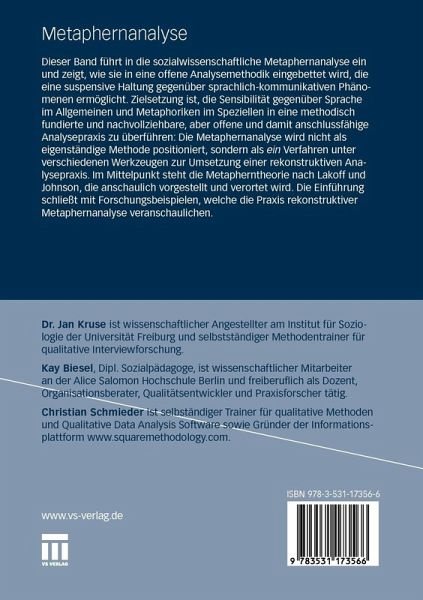 Dieser Band führt in die sozialwissenschaftliche Metaphernanalyse ein und zeigt, wie sie in eine offene Analysemethodik eingebettet wird, die eine suspensive Haltung gegenüber sprachlich-kommunikativen Phänomenen ermöglicht. Zielsetzung ist, die Sensibilität gegenüber Sprache im Allgemeinen und Metaphoriken im Speziellen in eine methodisch fundierte und nachvollziehbare, aber offene und damit anschlussfähige Analysepraxis zu überführen: Die Metaphernanalyse wird nicht als eigenständige Methode positioniert, sondern als ein Verfahren unter verschiedenen Werkzeugen zur Umsetzung einer rekonstruktiven Analysepraxis. Im Mittelpunkt steht die Metapherntheorie nach Lakoff und Johnson, die anschaulich vorgestellt und verortet wird. Die Einführung schließt mit Forschungsbeispielen, welche die Praxis rekonstruktiver Metaphernanalyse veranschaulichen.