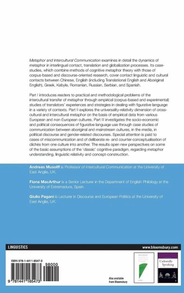 Metaphor and Intercultural Communication examines in detail the dynamics of metaphor in interlingual contact, translation and globalization processes. Its case-studies, which combine methods of cognitive metaphor theory with those of corpus-based and discourse-oriented research, cover contact linguistic and cultural contacts between Chinese, English including Translational English and Aboriginal English, Greek, Kabyle, Romanian, Russian, Serbian, and Spanish. Part I introduces readers to practical and methodological problems of the intercultural transfer of metaphor through empirical (corpus-based and experimental) studies of translators' experiences and strategies in dealing with figurative language in a variety of contexts. Part II explores the universality-relativity dimension of cross- and intercultural metaphor on the basis of empirical data from various European and non-European cultures. Part III investigates the socio-economic and political consequences of figurative language use through case studies of communication between aboriginal and mainstream cultures, in the media, in political discourse and gender-related discourses. Special attention is paid to cases of miscommunication and of deliberate re- and counter-conceptualisation of clichés from one culture into another. The results open new perspectives on some of the basic assumptions of the 'classic' cognitive paradigm, e.g. regarding metaphor understanding, linguistic relativity and concept-construction.