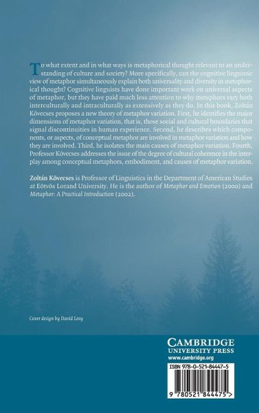 1. Introduction: metaphor and the issue of universality; Part I. Universal Metaphors: 2. Metaphor: from language to body and back; 3. Universality in metaphorical conceptualization; Part II. Dimensions of Metaphor Variation: 4. Cross-cultural variation; 5. Within-culture variation in metaphor; Part III. Aspects of Metaphor Involved in Variation: 6. How components of conceptual metaphor are involved in variation; 7. Conceptual metaphors and their linguistic expression in different languages; 8. Metaphor in social-physical reality; 9. Metaphors and cultural models; Part IV. Causes of Metaphor Variation: 10. Causes of variation in metaphor; 11. Creativity: metaphor and blending; 12. Culture, coherence, conflict; References; Index.