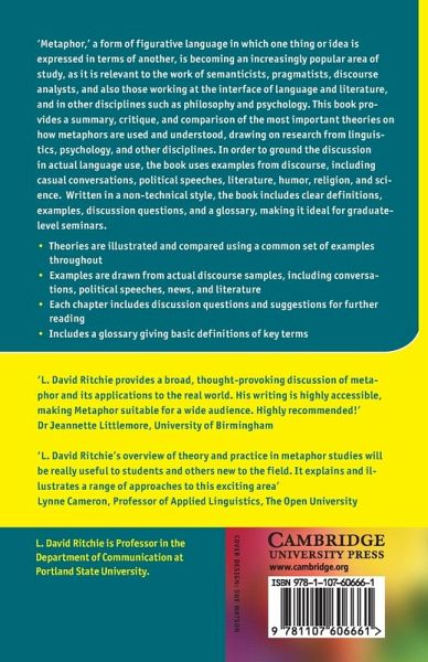 'Metaphor', a form of figurative language in which one thing or idea is expressed in terms of another, is becoming an increasingly popular area of study, as it is relevant to the work of semanticists, pragmatists, discourse analysts and also those working at the interface of language and literature and in other disciplines such as philosophy and psychology. This book provides a summary, critique and comparison of the most important theories on how metaphors are used and understood, drawing on research from linguistics, psychology and other disciplines. In order to ground the discussion in actual language use, the book uses examples from discourse, including casual conversations, political speeches, literature, humor, religion and science. Written in a non-technical style, the book includes clear definitions, examples, discussion questions and a glossary, making it ideal for graduate-level seminars.