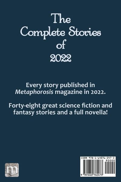 Beautifully written speculative fiction from Metaphorosis magazine. Forty-eight great science fiction and fantasy stories and an equally great serialized novella. All the stories we published in 2022. Contents From the Editor JanuaryMy Synthetic Soul - Karris Rae In the House of Geometers - David Cleden Silo - J.S. DiStefano Shades of the Sea - J.A. Prentice FebruaryA Lie in the Sand - Devin Miller Heartbeat of the Seasons - Brian Hugenbruch Freely Given - Connor Mellegers The Diary of Thisne Ome - Thomas Ouphe MarchHope on the Vine - R.E. Dukalsky Mission and Submission - Will Gwaun The Future in a Wash Basin - Erin Keating The Year of the Bright Lands - Felix Taylor AprilThe Dragon and the Unicorn - Wade Dargin The Ghosts of Daughters Possible - Amman Sabet The Last Doctor - Jonathan Louis Duckworth The Spinster and the Sea - J.C. Pillard Sturm und Clang - Sara Kate Ellis MayIndicative of Future Results - C.H. Rosenberg Medusa Rising - Christine Lucas From a Mother to Her Daughter, on the Eve of Her Wedding - Elliott Gish Midnight's Second Station - Chloe Smith JuneSince We Don't Have Wings - Gwen Whiting Time, Wolf, Emit, Flow - Anna Madden Her Spirit Animal - L.A.W. Butler Tashala's Hair - Richard Strachan JulyThe Eye of the Goddess - Samuel Parr The Lost Library - Mahmud El Sayed By the Scars Shall You Know - Daniel Ausema The Girl Who Drew the World - L.D. Oxford The Heebie-Jeebie Beam - E.C. Fuller Queen of Crows - Rachel Ayers AugustThe Hissing Trees - Ian Donnell Arbuckle The Crystal Pyramid - Mia Ram Frozen in Glass - Hope Davies SeptemberTo the Wild Sea - B. Morris Allen For the Love of Wild Things - Mande Matthews Her Last Will - Karl El-Koura Portals and Other Lost Things - Elizabeth Rankin Infinite Possibilities I - Michael Gardner OctoberProblems of the Flesh - Hamilton Perez A Xenothanatologist's Guidebook to Death Practices Among the Sapient Species of the Outer Perseus Arm of the Milky Way Galaxy - P.G. Streeter Holding On - Justen Russell Infinite Possibilities II - Michael Gardner NovemberIf Gold Runs Red - Gordon Grice Bas Relief - Joshua Grasso An Hour in the City of Lightning - A.D. Guzman Infinite Possibilities III - Michael Gardner DecemberThe Dragon's Due - Christopher Warden Through the Middle - J.B. Kish Love, Death, and the Electric Soul - Alexandra Peel Snowman - Han Whiteoak Infinite Possibilities IV - Michael Gardner