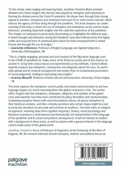 This book explores the metaphors used in public and media communication to ask how language shapes our moral reasoning about the global coronavirus crisis. The author offers insights into the metaphors, metonyms, allegories and symbols of the global crisis and examines how they have contributed to policy formation and communication. Combining metaphor theory with moral foundations theory, he places metaphors in their historical contexts, and then critically questions why certain tropes might be used in particular situations to persuade and convince an audience. The book takes an integrated approach, involving ideas from cognitive linguistics, history, social psychology and literature to produce a multi-layered and thematically rich interpretation of the language of the pandemic and its social and political consequences. It will be relevant to readers with a background in these areas, as well as anyone with a general interest in the language used to make sense of this global event.