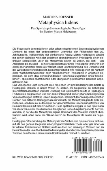 Das vorliegende Buch versucht, die Frage nach Ort und Bedeutung des Spiels in Heideggers Denken in neuer Weise zu stellen. Im Gegensatz zu bisherigen Interpretationsansätzen wird der Ursprung des Spielmotivs bereits in Heideggers Frühdenken aufgewiesen und vor dem Hintergrund seiner phänomenologischen Voraussetzungen entfaltet. Davon ausgehend, erscheint das "seinsgeschichtliche" Denken des mittleren Heidegger als ein Versuch, die Metaphysik gerade nicht abzustoßen, sondern sie in das Spiel der geschichtlichen Erscheinungsformen von Sein und Denken mit hineinzunehmen. Beim späten Heidegger ist das Spiel dann vor allem von seiner musikalischen, klanglichen Bedeutungskomponente her verstanden, in der die der Metaphysik eigene Dominanz des Visuellen implizit überwunden wird, ohne dabei die "Grund-sätze der Metaphysik als solche zu negieren.