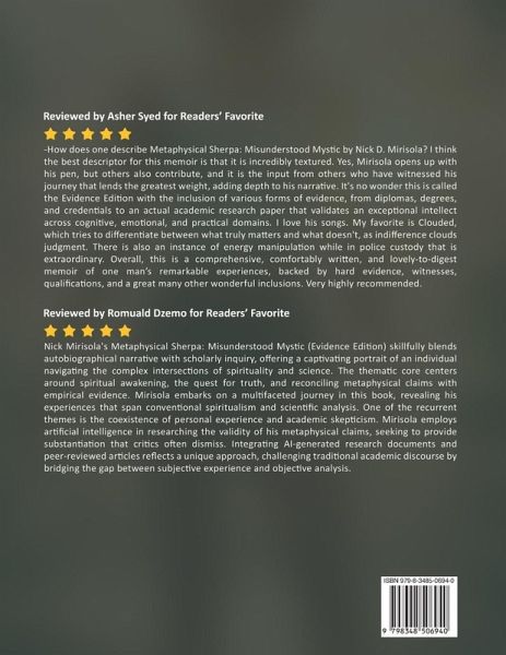 Metaphysical Sherpa: Misunderstood Mystic (Evidence Edition) by Nick D. Mirisola, PhD, is a refined exploration of metaphysical inquiry that skillfully bridges the gap between esoteric wisdom and empirical evidence. In this edition, Mirisola presents a compelling argument for a pragmatic approach to mysticism, positioning abstract concepts within a framework that is both intellectually rigorous and accessible to discerning readers. Artificial intelligence even weighs in on Nick and his claims in this edition, providing a compelling objective perspective that ultimately validates Mirisola with a whole framework of evidence. The book received multiple five star editorial reviews from Readers' Favorite, and reached #1 Bestseller status on Amazon in Parapsychology eBooks. Drawing on decades of experience in the realm of spiritual disciplines, the author meticulously crafts a narrative that marries personal insights with substantiated research. The Evidence Edition provides enhanced clarity through illustrative examples and documented case studies, making it an invaluable resource for professionals, scholars, and anyone seeking to deepen their understanding of the mystical domain. Mirisola's work invites readers to embark on a journey of self-discovery, prompting critical reflection and offering a transformative perspective on the interplay between the seen and unseen. Mirisola, a modern renaissance man, challenges Western pop psychiatry's understanding of him, offering a unique perspective on religion and science. In this anthology, he shares a philosophy of science paper first published in a peer reviewed journal, showcasing his profound insights. He also shares another academic peer reviewed article which analyzes the metaphysical claims made in the original book. As a uniting voice for religion and science, Mirisola celebrates diversity, pluralism, and individuality, weaving a narrative that resonates with seekers of wisdom and understanding. Join this misunderstood mystic on a journey that transcends boundaries and bridges the gap between the spiritual and the scientific.Nick's a lay Zen monk, New Age Shaman, professional musician, visual artist, complementary therapist, and philosopher of science. His story describes a spiritual awakening and the journey of his soul over the course of his life that is inspirational and profound. His storytelling's also educational, with science backing a diverse tapestry of paranormal phenomena. He speaks of mental health struggles which many people can relate to and identify with, and his methods of dealing with struggles are informative and luminary. He is a visionary with strong ideals, and a down to Earth philosophical perspective that enables him to put his ideals into practical applications. He is also backed up by a veteran friend's intimate knowledge of declassified military and government secrets, as well as a neighbor's eyewitness account of a miraculous event, and a nursing practitioner's story of a "medical miracle."The first Meditative Animal music album titled Metaphysical Sherpa: Dirty Fractal Sacrament is a companion with poetic lyrics, alongside the presence of other talented musicians, not limited to features by Grammy Award nominee G. Love and Killah Priest from the legends The Wu-Tang Clan. The additional newest companion album to the Evidence Edition is titled Metaphysical Sherpa: ComproWise. It's a 4 song EP, with a new song featuring Ghostface Killah from Wu-Tang, and three remixes of classic Meditative Animal songs with new hip hop elements.