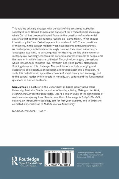 This volume critically engages with the work of the acclaimed Australian sociologist John Carroll. It makes the argument for a metaphysical sociology, which Carroll has proposed should focus on the questions of fundamental existence that confront all humans: 'Where do I come from?', 'What should I do with my life?' and 'What happens to me when I die?'. These questions of meaning, in the secular modern West, have become difficult to answer. As contemporary individuals increasingly draw on their inner resources, or 'ontological qualities', to pursue quests for meaning, the key challenge for a metaphysical sociology concerns the cultural resources available to people and the manner in which they are cultivated. Through wide-ranging discussions which include, film, romantic love, terrorism and video games, Metaphysical Sociology takes up this challenge. The contributors include emerging and established sociologists, a philosopher, a renowned actor and a musician. As such, this collection will appeal to scholars of social theory and sociology, and to the general reader with interests in morality, art, culture and the fundamental questions of human existence.