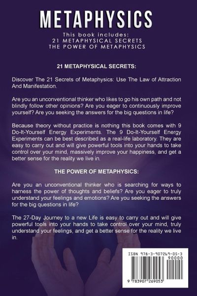 This book includes 2 manuscripts 21 METAPHYSICAL SECRETS Discover The 21 Secrets of Metaphysics: Use The Law of Attraction And Manifestation. Are you an unconventional thinker who likes to go his own path and not blindly follow other opinions? Are you eager to continuously improve yourself? Are you seeking the answers to the big questions in life? If you can resonate with those questions you should not hesitate longer and buy The 21 Secrets of Metaphysics. Among others, this book will reveal you the secrets to: How to use the Law of Attraction How to find your Purpose in Life The Nature of Reality How to manifest Success in Life How to control your Thought How to (re-)program your Beliefs Because theory without practice is nothing this book comes with 9 Do-It-Yourself Energy Experiments. The 9 Do-It-Yourself Energy Experiments can be best described as a real-life laboratory. They are easy to carry out and will give powerful tools into your hands to take control over your mind, massively improve your happiness, and get a better sense of the reality we live in. THE POWER OF METAPHYSICS Are you an unconventional thinker who is searching for ways to harness the power of thoughts and beliefs? Are you eager to truly understand your feelings and emotions? Are you seeking the answers to the big questions in life? If you can resonate with those questions you should not hesitate longer and buy The Power of Metaphysics. Among others, this book will reveal you the secrets to: Why Silence is your greatest Teacher How to transform your Feelings and Emotions How to manifest Success in Life How your Mind creates the Reality Use the Power of Focus How to find your Purpose in Life The 27-Day Journey to a new Life is easy to carry out and will give powerful tools into your hands to take control over your mind, truly understand your feelings, and get a better sense of the reality we live in.