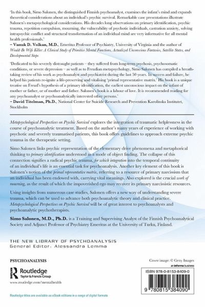 Metapsychological Perspectives on Psychic Survival explores the integration of traumatic helplessness in the course of psychoanalytic treatment. Based on the author's many years of experience of working with psychotic and severely traumatised patients, this book offers guidelines to approach extreme psychic trauma in the therapeutic setting. Simo Salonen links psychic representation of the elementary drive phenomena and metaphorical thinking töprimary identification understood as a mode of object finding. The collapse of this connection signifies a radical psychic trauma, the integration of which into the temporal continuity of an individual's life is an essential task for psychoanalysis. Another key element of this book is Salonen's notion of the primal representative matrix, referring to a resource of primary narcissism that an individual has been endowed with, carrying vital meanings. Also explored is the crucial work of mourning, as the result of which the impoverished ego may recover its primary narcissistic resources.¿ Using insights from numerous case studies, Salonen offers a new way of understanding severe trauma, which can be used to advance both psychoanalytic theory and clinical practice. Metapsychological Perspectives on Psychic Survival will be of great interest to psychoanalysts and psychoanalytic psychotherapists.